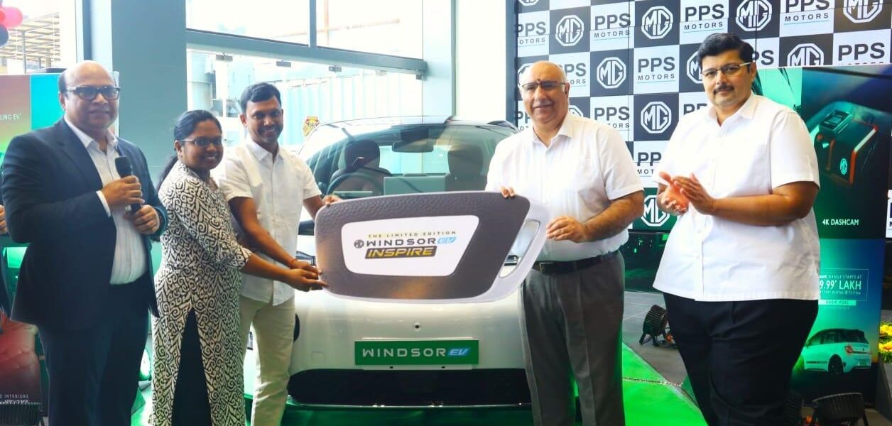 Hyderabad, October 15, 2025: PPS Motors today announced the launch of the Windsor Inspire Edition, a limited edition of India’s best-selling EV, built to celebrate one year of Windsor’s remarkable journey in the country at its LB Nagar showroom at Hyderabad. The Inspire Edition draws from the strong love and trust that the Windsor has received from customers, crossing the milestone of 40,000 units in less than a year. With only 300 units to be produced, the Inspire Edition is both a commemoration of the Windsor’s success and a symbol of the spirit of inspiration that continues to drive India’s electric mobility movement. PPS Motors delivered the first MG Windsor Inspire Edition vehicle in Hyderabad to a customer by Vinay Raina, Chief Commercial Officer, JSW MG Motor India, Rajiv Sanghvi, Managing Director, PPS Motors, in the presence of Saurav Prakash, Zonal Head (South), JSW MG Motor India, and other senior officials from both the organizations.